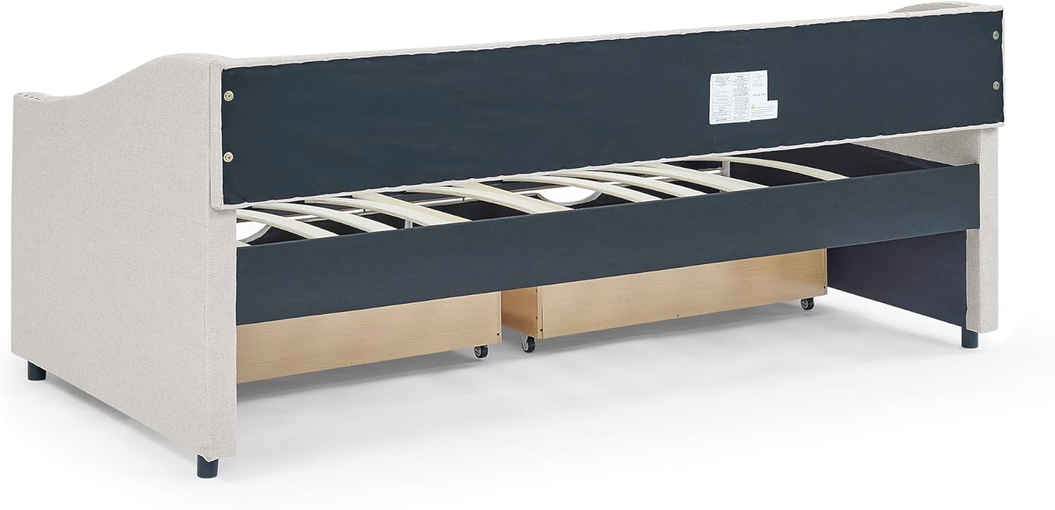 SOFTSEA focuses on providing you with high-quality furniture and is committed to bringing happiness to every buyer's life. This upholstered daybed not only can be a bed to be placed in your bedroom but also is ideal to be a sofa or seat in your living room. It can meet your different needs perfectly which allows the cozy bed to afford a comfortable seating experience. Overall Dimensions: 81.5"L x 41"W x 30.5"H (Twin) / 80.5"L x 55.5"W x 27.5"H (Full) / 84.5"L x 63.5"W x 26.5"H (Queen) Bed Inner Dimensions: 75"L x 39"W (Twin) / 75"L x 55"W (Full) / 80"L x 60"W (Queen) Drawer Dimensions: 33.6"L x 20"W x 5.5"H Recommended Mattress Thickness: 8" Numbers of Slats Included: 13 Color: Grey / Beige Bed Weight Capacity: 500LBS Overall Product Weight: 98LBS/ 112LBS / 132LBSUpholstery Material: Polyester Frame Material: Eucalyptus Wood + MDF + Plywood Level of Assembly: Full Assembly Needed Suggested Number of People: 2 Warranty Time: Six Months(Manufacture Defect) Additional Tools Required: Screwdriver Needed Number of Package: 2 Country of Origin: VietnamSOFTSEA Notice: All colors on our website are for reference only, actual product colors may vary a little bit, due to different color settings of every screen device. Please note: most of our furniture is hand-measured, therefore the dimensions are for reference only, and may marginally deviate.