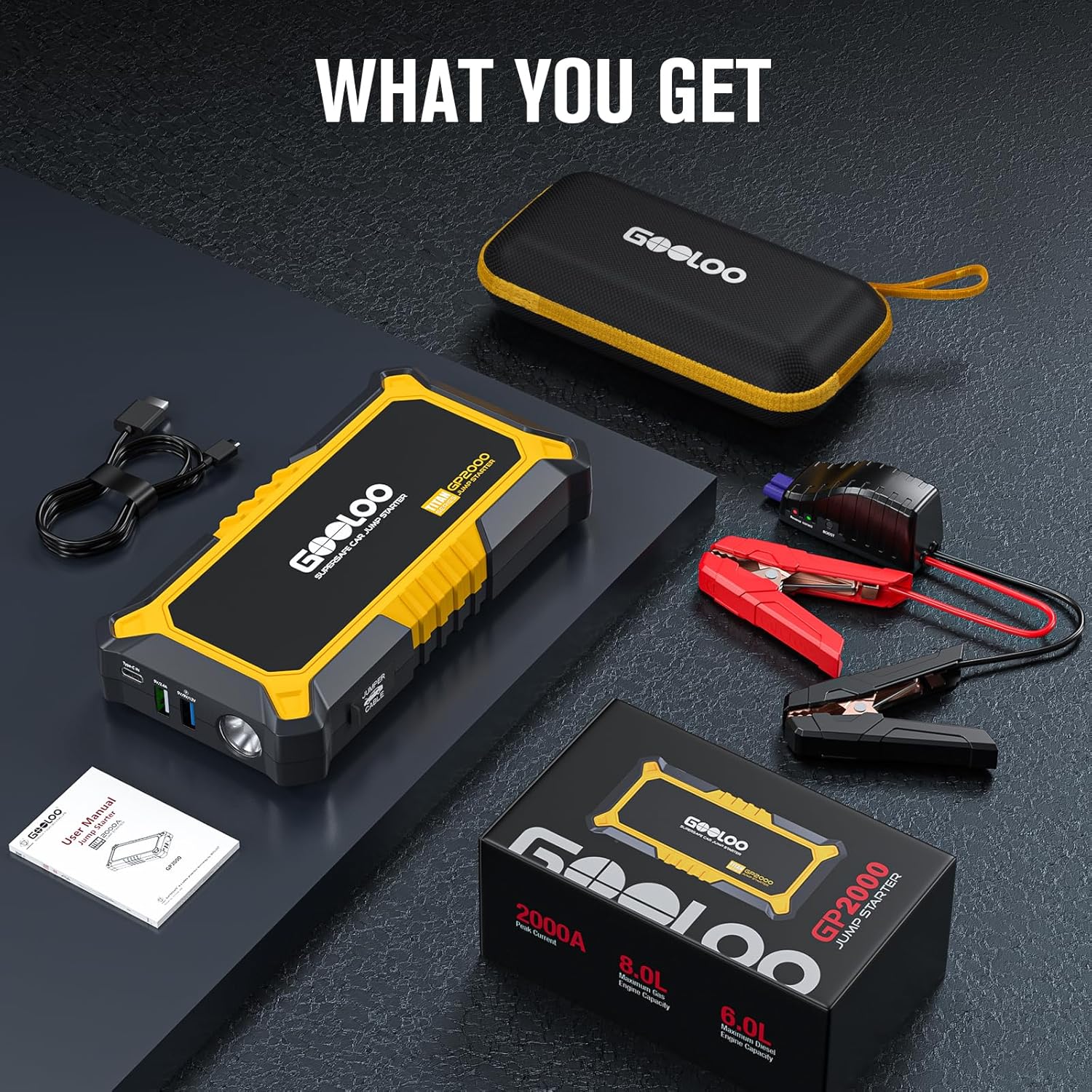 POWERFUL BATTERY JUMP STARTER - With 3000 Amps peak cranking power, the GP3000 battery starter can start almost all 12-volt dead vehicles (up to 10-liter gasoline and 8-liter diesel engines) easily and safely. The “BOOST” button is necessary when the car battery is totally dead or the battery voltage is too low to detect. The GP3000 car jump starter battery pack is suitable for cars, motorcycles, SUVs, trucks cargo vans, ATVs, snowmobiles, yachts, and many more. Emergency Life Saver:The GOOLOO car battery charger jump starters with 2000A peak cranking power will jump start all 12-volt dead vehicles up to 8.0L gas or 6.0L diesel. The GP2000 car jump starter battery pack is suitable for cars, motorcycles, SUVs, trucks cargo vans, ATVs, snowmobiles, yachts, and many more. 10 SECURITY PROTECTIONS: The GP3000 smart jumper cable is constructed with all-metal heavy-duty clamps to prevent breakage caused by long-term use. And it has 10 protections(over-charge, over-current, short-circuit, reverse-polarity, low-temp, high-temp, over-voltage, over-load, spark-proof, reverse-charge), making the GP3000 car battery charger jump starter safe for anyone to use even in extreme environments from -4°F to 140°F. Affordable and Powerful: More than a portable car jumper starter, this versatile GP2000 jump box doubles as a portable power bank, equipped with two USB outputs (5V/9V/12V) and (5V/2.4A), allowing you to charge your devices on the go. Additionally, it features a 400-lumen LED flashlight (Normal,Strobe,SOS), providing illumination during dark situations and emergencies. With the GP2000 Car jump starter, you can enjoy the convenience of 4 in 1 powerful device at an affordable price. Rugged 12V Jump Starter:The hardened plastic and scratch-resistant shell allow the car battery jump starter to withstand drops without issue. Highly Efficient Circuit Design makes GP2000 battery booster boasts a remarkable 24-month standby time,alleviating any concerns about losing charge during stor
