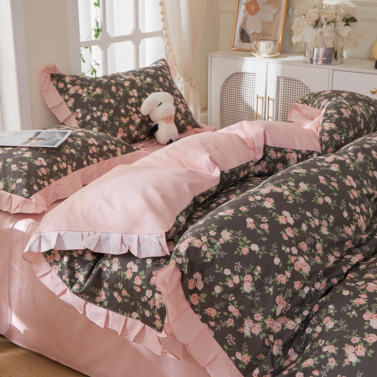 Bring Nature Indoors with MKXI’s Beige & Green Floral Comforter Set!Transform your bedroom into a serene oasis with the MKXI Full Size Beige & Green Floral Comforter Set. Designed for girls and women who adore a soft aesthetic and cottagecore vibes, this 3-piece bedding set includes a Queen-sized comforter and 2 matching pillowcases, all crafted from 100% premium cotton for unmatched softness and breathability.Why You’ll Love It: Elegant Design: Featuring a beige background with green leaf and floral patterns, this comforter set adds a touch of vintage boho charm to your bedroom. The ruffled lace edges and reversible design offer versatility, allowing you to switch up your style effortlessly.Ultra-Soft Comfort: The high-quality cotton fabric feels incredibly soft against your skin, making it perfect for all-season use. Whether it’s summer or winter, this lightweight comforter ensures a comfortable night’s sleep.Complete Bedding Solution:The set includes a Queen-sized comforter and 2 pillowcases, providing everything you need to create a cohesive and stylish bedroom look.Perfect for Every Style: Whether you’re going for a shabby chic, princess-style, or farmhouse-inspired bedroom, this comforter set fits seamlessly into any decor theme.